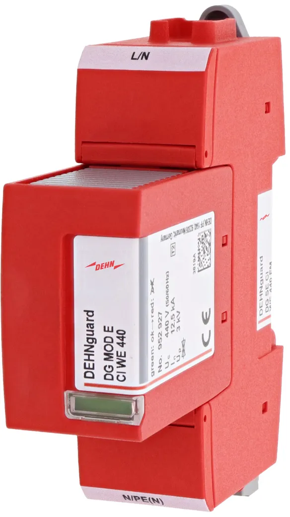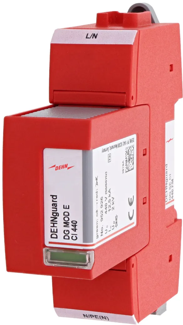 Modulo di protezione da sovratensioni unipolare, componibile, con tensione di riferimento varistore Umov = 750 V AC, costituito da base e modulo di protezione innestato; con fusibile integrato e contatto di telesegnalamento per dispositivi di controllo (contatto di scambio pulito).