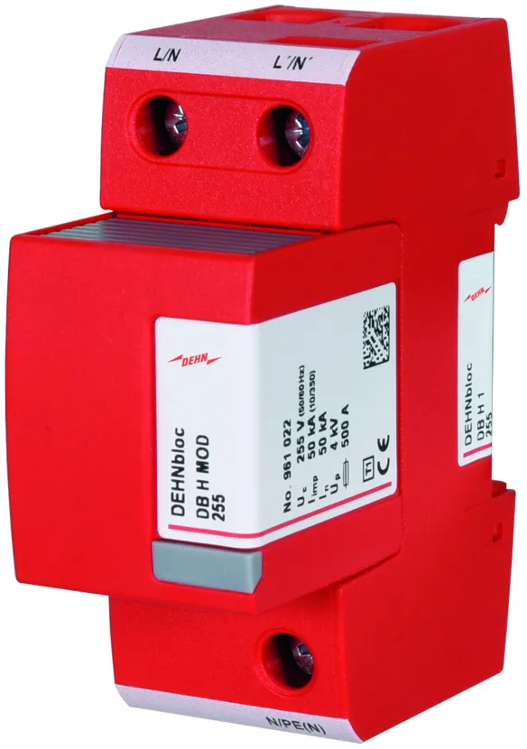 Scaricatore per corrente di fulmine modulare DEHNbloc H M 1 255 Scaricatore coordinato per corrente di fulmine, unipolare, modulare, con elevata capacità di scarica Con contatto di scambio pulito per il telesegnalamento Dimensioni: 2 unità SPD Tipo 1 secondo EN 61643-11/ ... CEI EN 61643-11 Tecnologia spinterometrica RADAX-Flow per la limitazione della corrente susseguente Scaricatore per corrente di fulmine modulare DEHNbloc H M 1 255 Scaricatore coordinato per corrente di fulmine, unipolare, modulare, innestabile, ccordinato Con elevata limitazione di corrente susseguente, larghezza 2 unità Scaricatore Tipo 1 secondo EN 61643-11 SPD Tipo 1 secondo EN 61643-11/ ... CEI EN 61643-11 Tecnologia spinterometrica RADAX-Flow per la limitazione della corrente susseguente Indicazione di guasto Massima tensione continuativa: 255 V AC Livello di protezione: <= 4 kV Corrente impulsiva di fulmine (10/350 µs): 50 kA Estinzione di correnti susseguenti di rete: fino a 100 kAeff Coordinamento energetico secondo CEI EN 62305-4 SPD della famiglia di prodotti Red/Line
