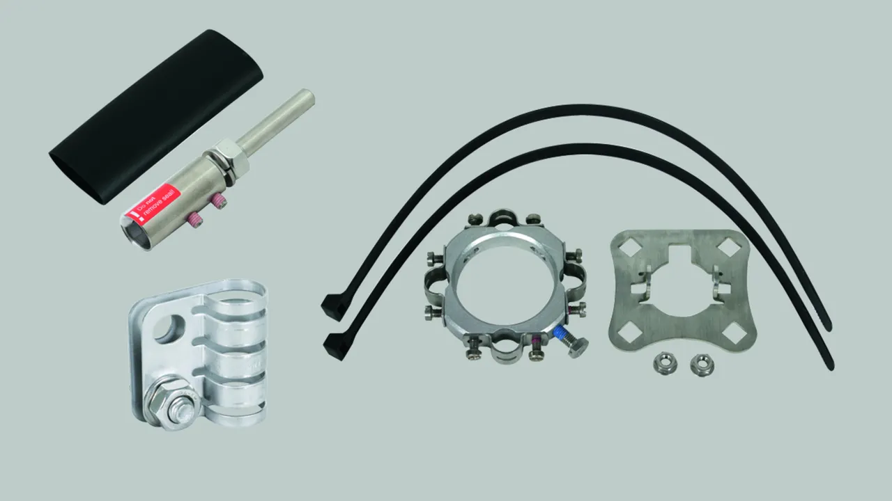 Set de fixation pour le montage d’un conducteur HVI light sur des tubes supports Ø50 mm (par ex. tube support HVI long), comprenant une plaque de raccordement (4 niveaux, deux écrous à embase crantée inclus) et une bague de fixation avec quatre porte-câbles fendus (Ø17 mm) pour la zone d’adaptation (deux fixations pour câble incluses).