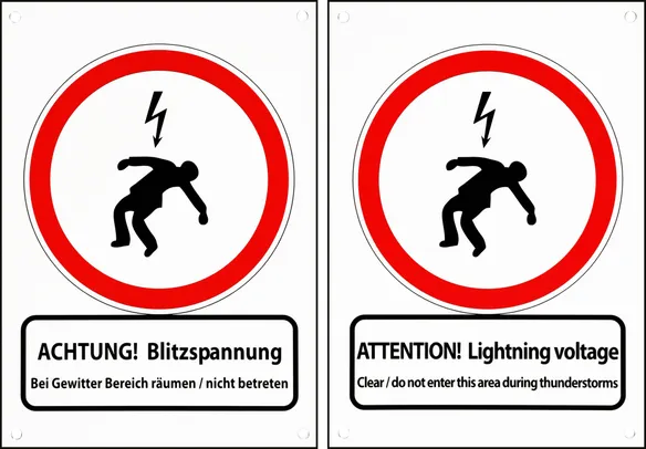 Cartello indicatore Attenzione: scariche atmosferiche Cartello indicatore Disposizione sul lato anteriore in tedesco: “ACHTUNG! Blitzspannung Bei Gewitter Bereich räumen / nicht betreten” Disposizione sul lato posteriore in inglese: "ATTENTION! Lightning voltage Clear / do not enter this area during thunderstorms"