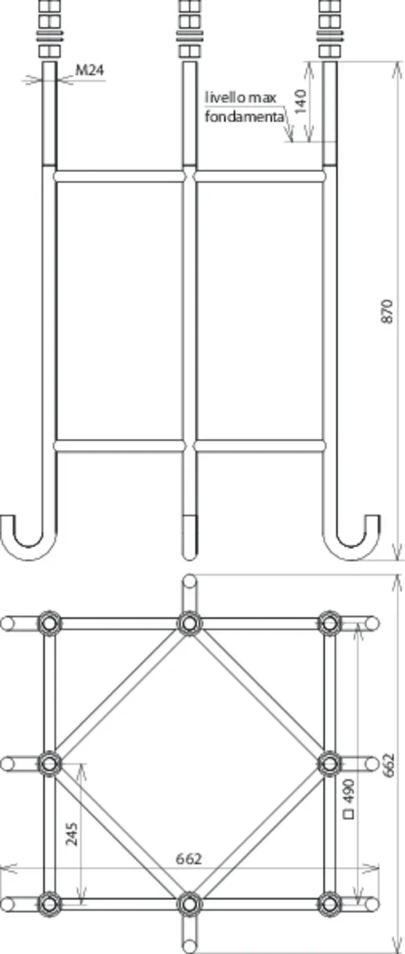| Esecuzione bullone filettato | 8x M24 (490 x 490 mm) |