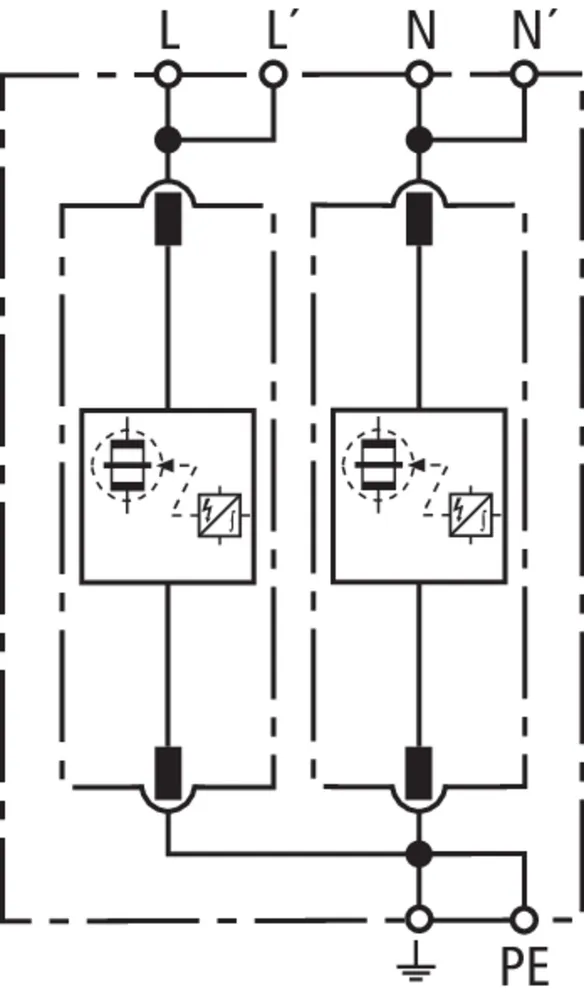 | Corrente impulsiva di fulmine (10/350 µs) [L, N-PE] (Iimp ) | 25 kA |