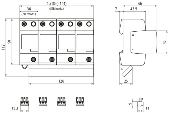 - caricatore combinato spinterometrico precablato Tipo 1 + Tipo 2 + Tipo 3, composto da elemento base e un singolo modulo di protezione innestabile