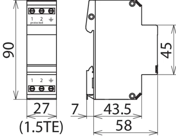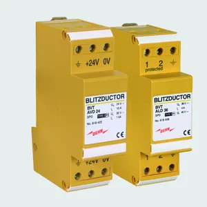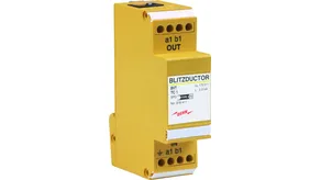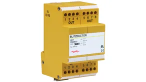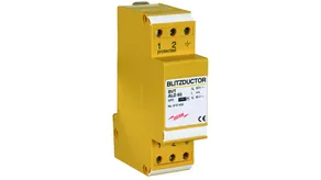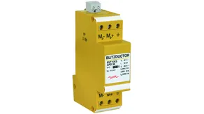 Scaricatore combinato coordinato energeticamente per la protezione di circuiti di misura della tensione (colore giallo). Contatto di telesegnalamento innestabile (contatto in apertura) per indicazione di sovraccarico (controllo termico dei percorsi di scarica). Si raccomanda il montaggio nella custodia in lamiera d'acciaio. Il controllo capacitivo consente di raggiungere una bassa tensione d'innesco dell'impulso.
