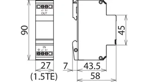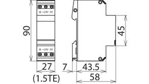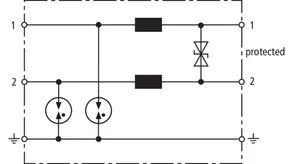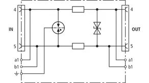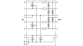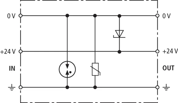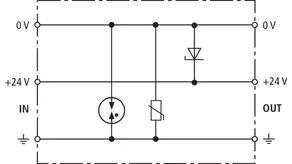 Limitatore di sovratensione con livello di protezione incrementato per protezione EMC di componenti elettroniche con approvvigionamento in tensione continua. Concepito in modo ideale su PLC della Siemens. Poiché si impiega un diodo unipolare, si deve rispettare la polarità della tensione di esercizio.