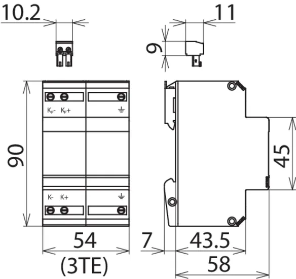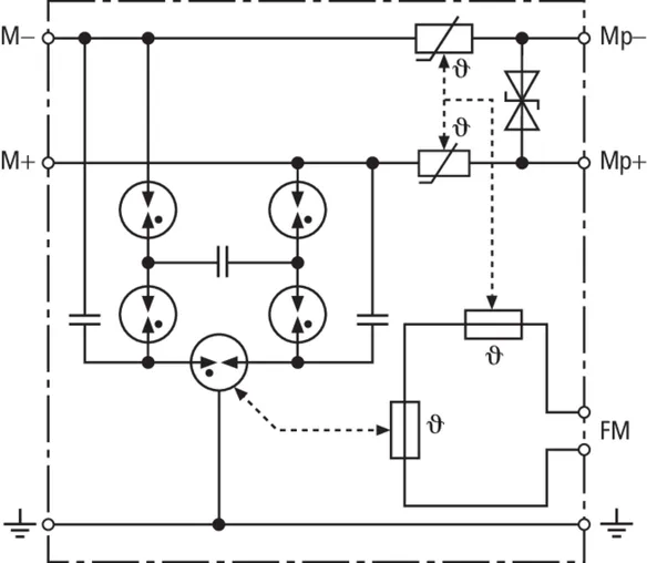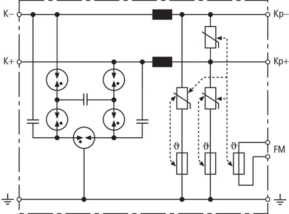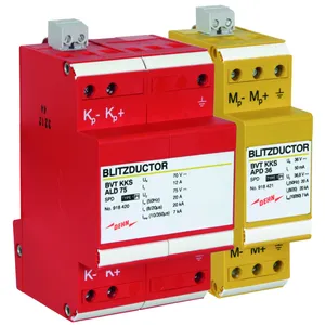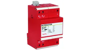 Scaricatore combinato coordinato energeticamente per la protezione di raddrizzatori di corrente nel percorso di protezione (colore rosso). Contatto di telesegnalamento innestabile (contatto in apertura) per indicazione di sovraccarico (controllo termico dei varistori). Si riccomanda il montaggio nella custodia in lamiera d'acciaio. Il controllo capacitivo consente di raggiungere una bassa tensione d'innesco dell'impulso.