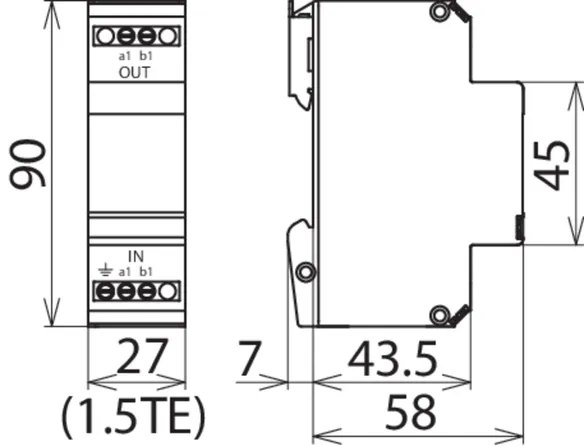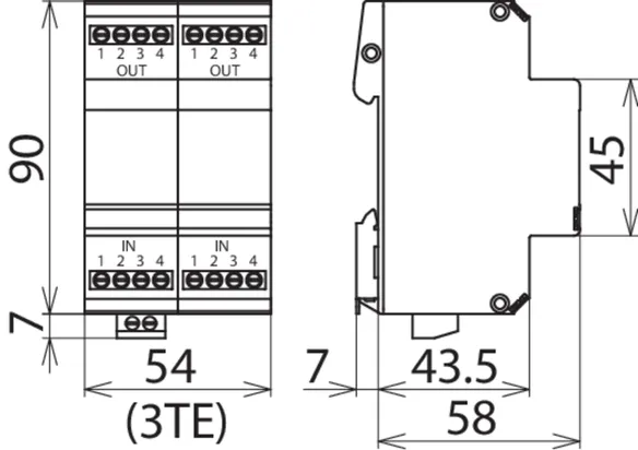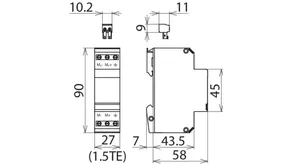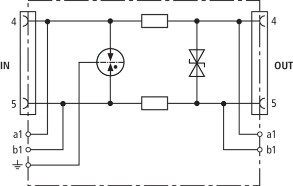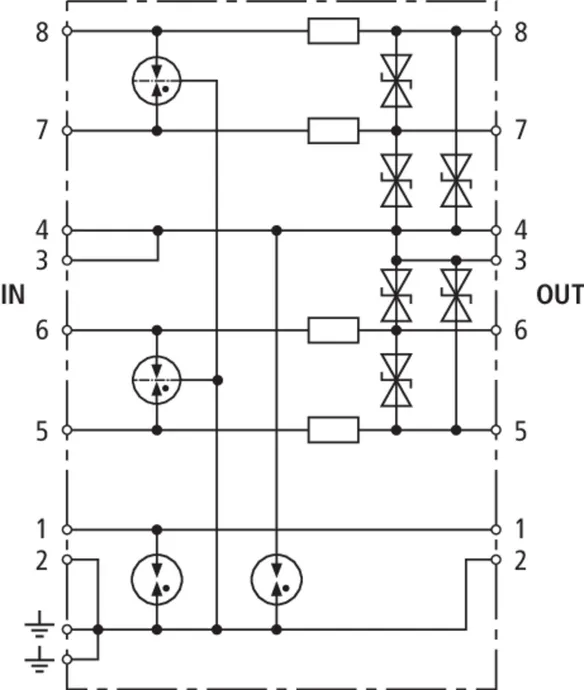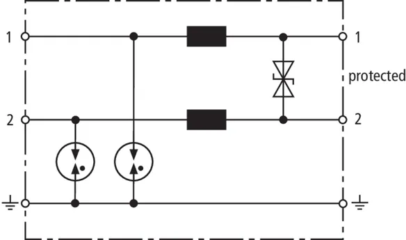 Limitatore di sovratensione coordinato energeticamente e senza corrente di fuga verso terra, per fil a/b, ASDB Uk0 o ADSL con prese RJ45 e connessioni supplementari con morsetto a vite. La piedinatura delle prese RJ45 e compatibile con RJ11/12. I morsetti a vite in parallelo sono più robusti delle prese RJ45 e aumentano la corrente impulsiva nominale di scarica a un totale di 10 kA.