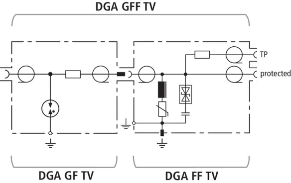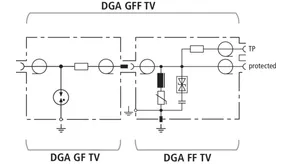 DGA ... TV sono limitatori adatti per alimentazioni remote con connettori "F" per impianti satellitari ed a banda larga a 75 Ohm. Gli scaricatori sono conformi alle richieste per la schermatura in classe A secondo EN 50083-2. Adatti per l'installazione con risparmio di spazio nelle più comuni applicazioni TV e SAT sono disponibili le esecuzioni di scaricatore per corrente di fulmine come anche limitatore di sovratensione oppure scaricatore combinato con integrata presa per misure per le prove nell'impianto.