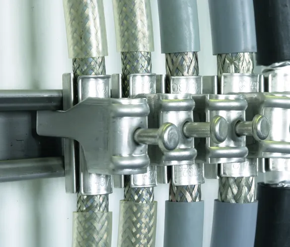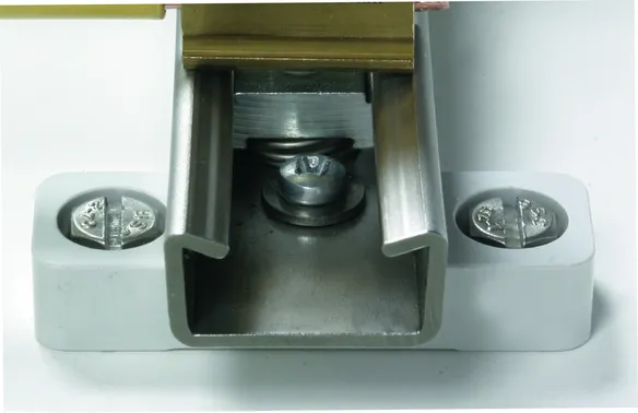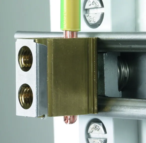 Morsetto per il collegamento di schermi, per la messa a terra dello schermo su guida profilata di ancoraggio. Adatto per l'equipotenzialità antifulmine. È possibile l'applicazione successiva senza interruzione dello schermo – montaggio senza l'ausilio di attrezzi.