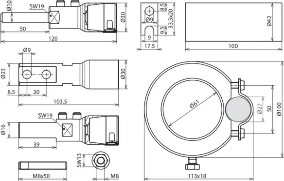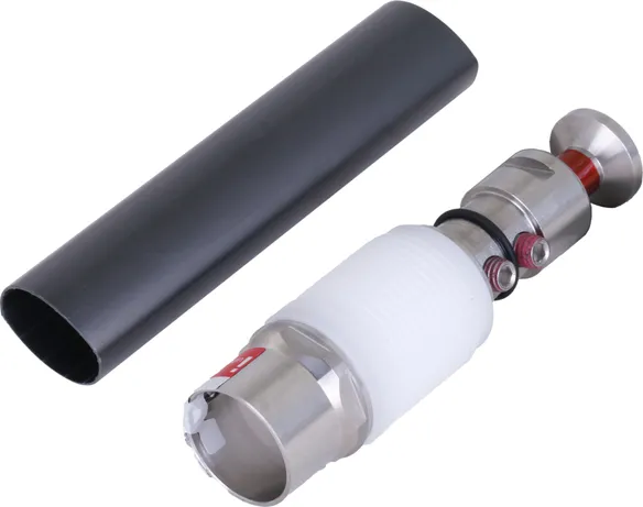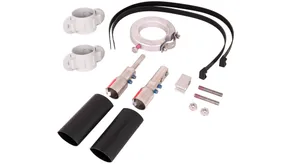 Set di connessione per conduttura HVI power per la posa nei tubi portanti HVI power in PRFV / Al costituito da elementi di connessione, barre filettate, elemento di connessione, tubo termorestringente, fascetta e anello di fissaggio con una staffa portafilo con fessura (Ø27 mm).