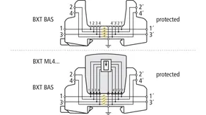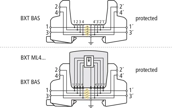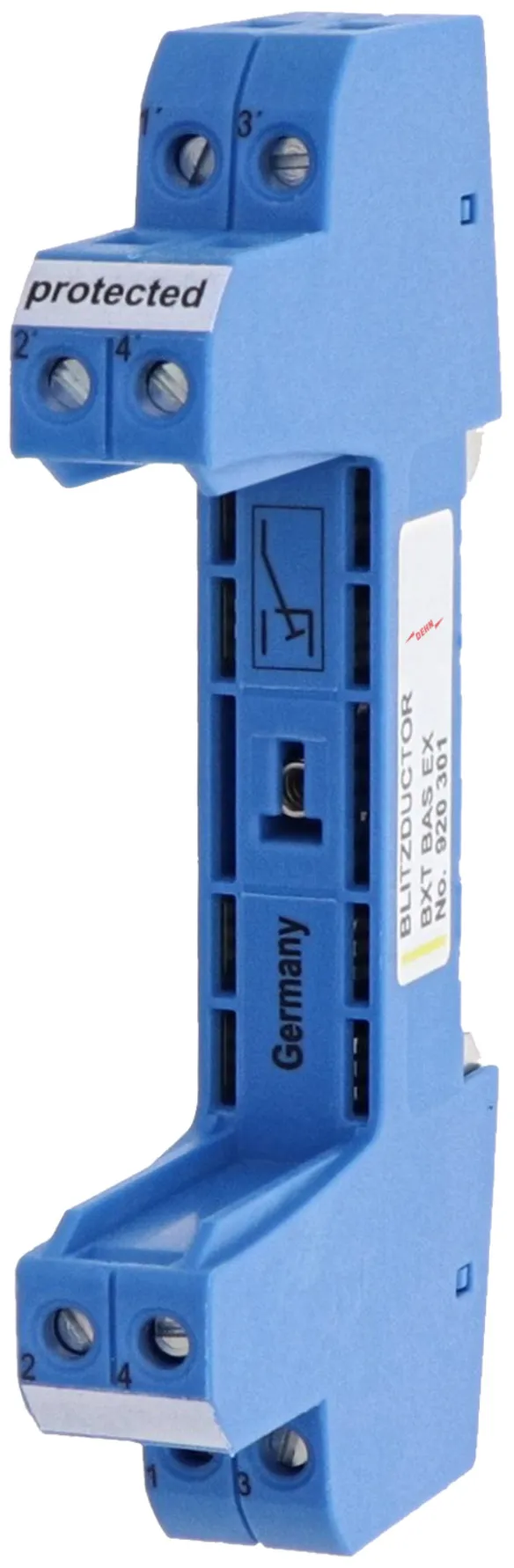 Elemento base del BLITZDUCTOR XT come morsetto passante universale tetrapolare in esecuzione stretta, per circuiti a sicurezza intrinseca, per l’innesto del modulo limitatore senza sezionamento del segnale in caso di modulo di protezione non innestato. La sicura messa a terra del modulo limitatore avviene tramite il piedino di fissaggio, montato a scatto sulla guida profilata. L’elemento base non contiene componenti di protezione, così i lavori di manutenzione si limitano ai moduli di protezione.