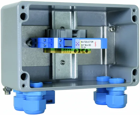 Limitatore di sovratensione, unità pronta per il collegamento, BXT ML4 BD EX 24 e BXT BAS EX montati in modo completo nella cassetta di allacciamento per circuiti a sicurezza intrinseca. Soddisfa i requisiti secondo FISCO.