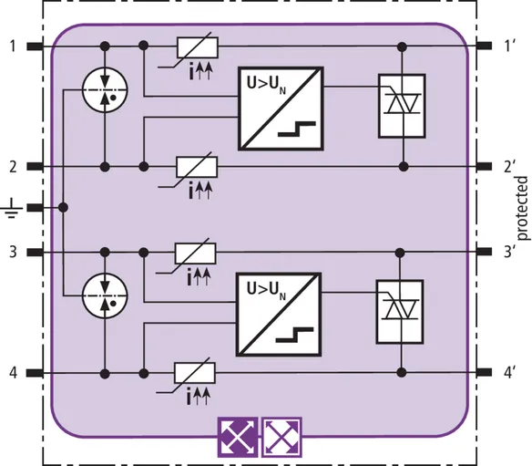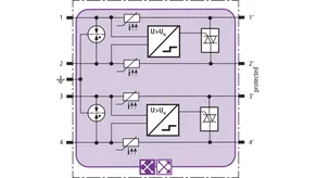 Modulo di protezione combinata in tecnologia actiVsense e RFID-LifeCheck, costruzione stretta, per la protezione di 2 coppie di fili a tensione uguale oppure diversa di interfacce simmetriche con separazione galvanica. Riconosce automaticamente la tensione d’esercizio del segnale applicato e adatta il livello di protezione in modo ottimale ad essa.