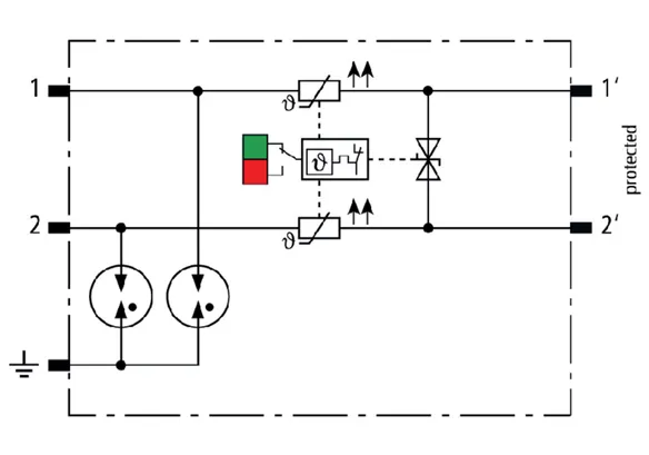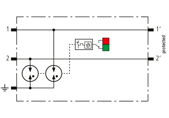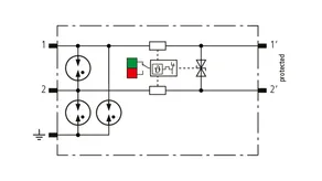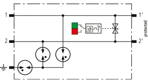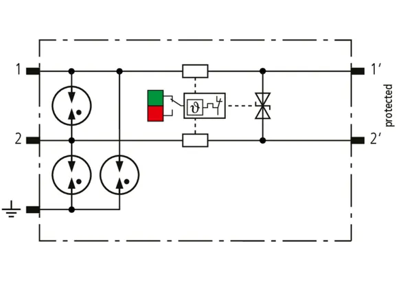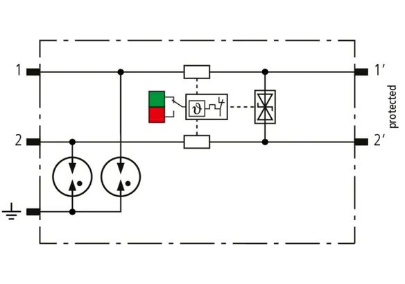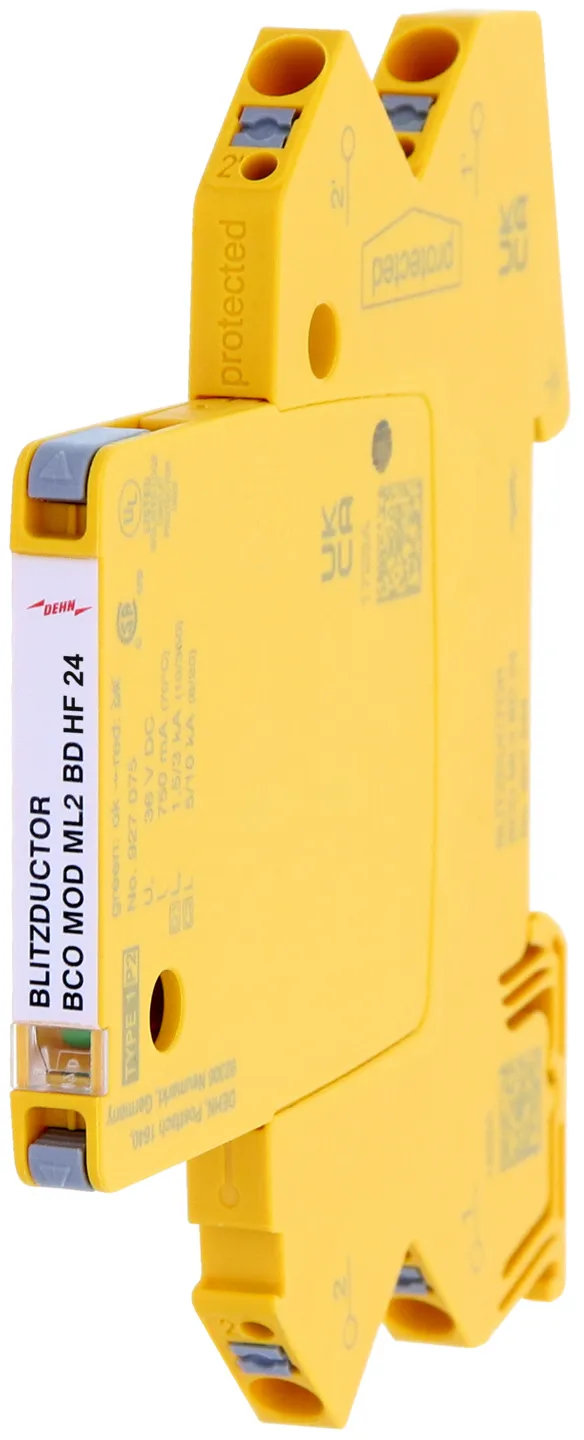 Scaricatore combinato modulare a risparmio di spazio con larghezza d’installazione di 6 mm e tecnica di connessione Push-in con indicazione di stato, per la protezione di 1 filo doppio in sistemi a 24 V DC. Impiego adatto anche con polo negativo di terra; le resistenze PTC integrate permettono un ripristino sicuro del SPD in seguito ad interferenza nel circuito dell’impianto con correnti di cortocircuito fino a 40 A. Con separazione di segnale per scopi di manutenzione.