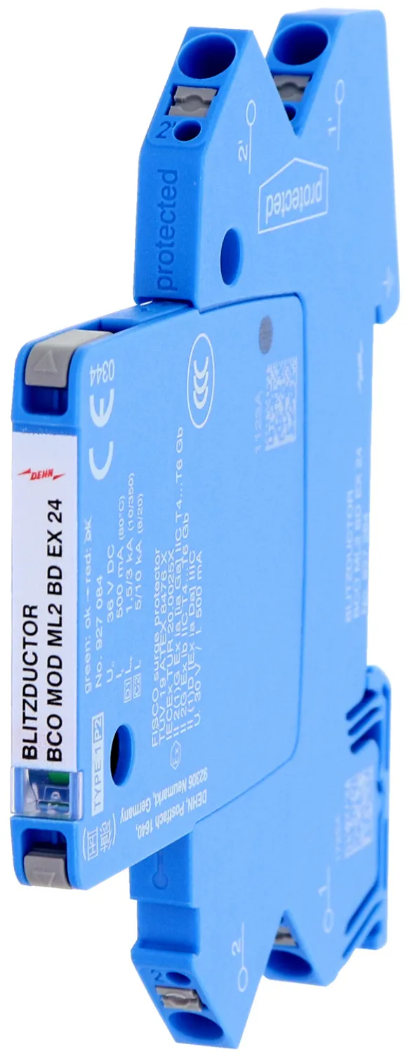 Modulo di protezione combinata in esecuzione stretta da 6 mm BLITZDUCTORconnect con indicazione di funzionamento per la protezione di 1 coppia di fili di circuiti di misura a sicurezza intrinseca e di sistemi bus. Adempie i requisiti secondo FISCO. Resistenza all'isolamento > 500 V filo-terra.