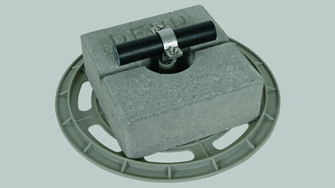 Zoccolo in cemento con cuneo Zoccolo in cemento con cuneo Peso totale: 8,5 kg per la protezione di piccole costruzioni per tetto su tetti piani con punta di captazione lunghezza 1 m (ad es. art. n. 101 001) o per la realizzazione di distanziatori della gamma di distanziatori DEHNiso ad es. per anelli perimetrali isolati.