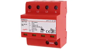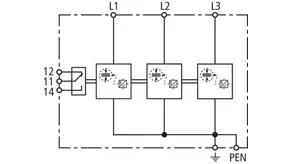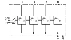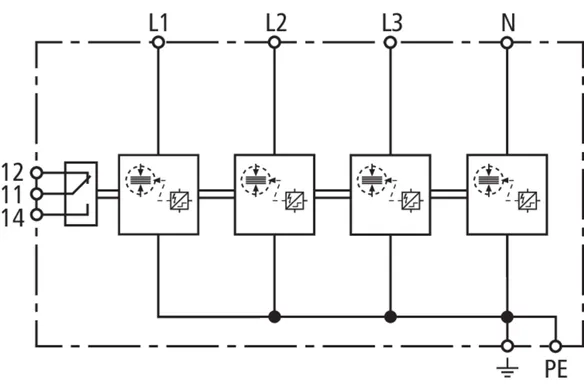 Scaricatore combinato per reti TN-C, pronto per il cablaggio ed ottimizzato nell'applicazione per l'impiego nella distribuzione principale (circuito 3+0) in edifici residenziali senza impianto parafulmine esterno (anche con alimentazione della linea aerea); con contatto di telesegnalamento a scambio pulito.