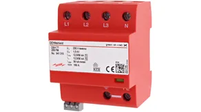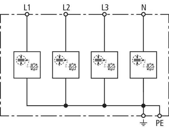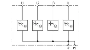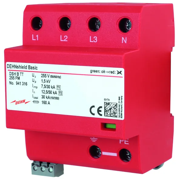 Scaricatore combinato per reti TT e TN-S, precablato e ottimizzato per l’applicazione per l’impiego in sistema di alimentazione principale (circuito 3+1) in edifici residenziali senza parafulmine esterno (anche con alimentazione della linea aerea); con contatto di scambio pulito per il telesegnalamento.