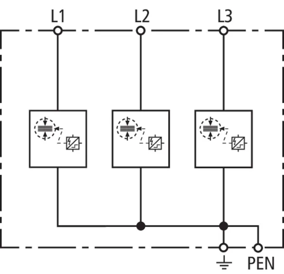 | Corrente impulsiva di fulmine (10/350 µs) [L1+L2+L3-PEN] (Itotal ) | 37,5 kA |