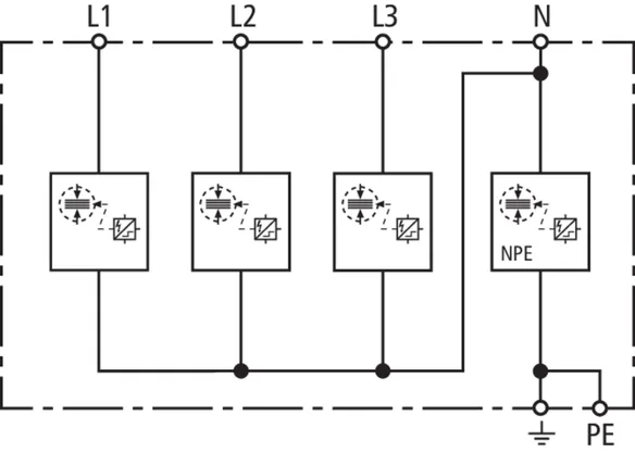 Scaricatore combinato per reti TN-S, pronto per il cablaggio ed ottimizzato nell'applicazione per l'impiego in sistema di alimentazione principale (circuito 4+0) in edifici residenziali senza impianto parafulmine esterno (anche con alimentazione della linea aerea); con contatto di telesegnalamento a scambio pulito.