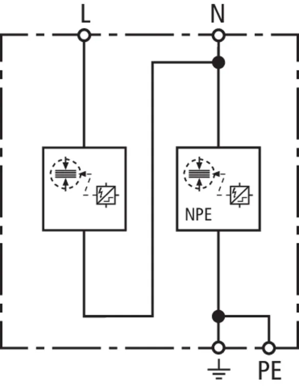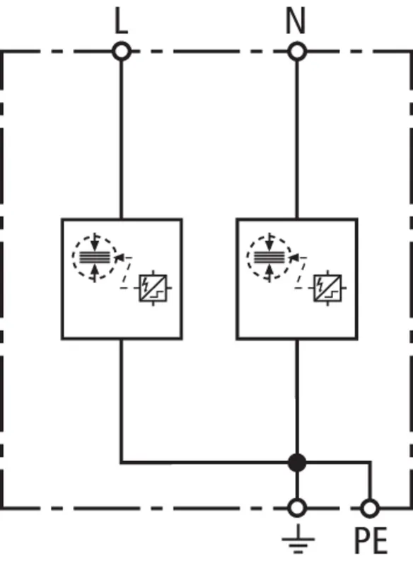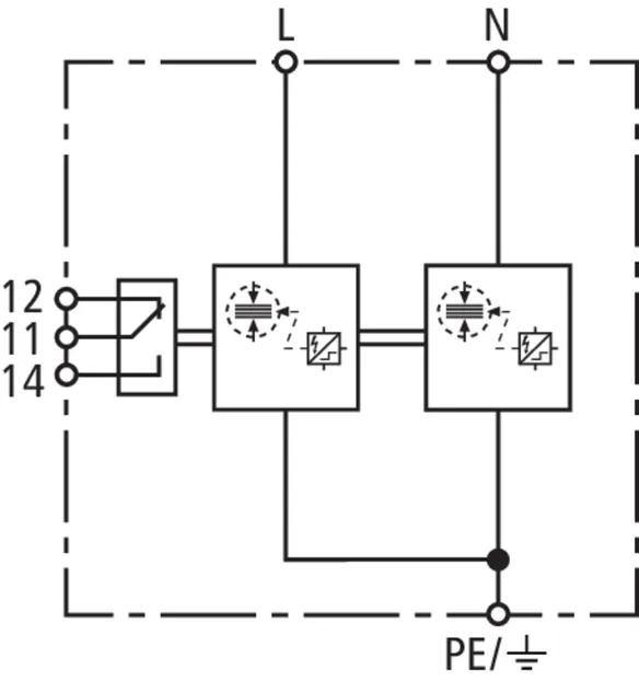 Scaricatore combinato per reti TN, pronto per il cablaggio ed ottimizzato nell'applicazione per l'impiego in sistema di alimentazione principale (circuito 2+0) in edifici residenziali senza impianto parafulmine esterno (anche con alimentazione della linea aerea); con contatto di telesegnalamento a scambio pulito.