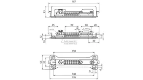 Barra per l'equipotenzialità Collegamenti per: 7 conduttori 2,5-25 mm2 (rigido / semirigido) 1 conduttore Td Ø7-10 mm 1 conduttore Pt fino a 30 x 3,5 mm oppure Td Ø8-10 mm