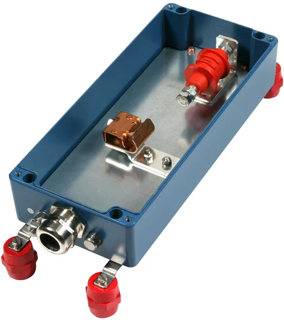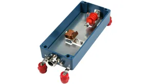 Coax-Connection Box con EXFS 100 Coax-Connection Box con spinterometro di sezionamento integrato Ex EXFS 100 secondo IEC 62561-3:2011 (81/387/CDV) / EN 62561-3 per la connessione coassiale Su pezzi e flange di siolamento. Spinterometro di sezionamento Ex con marcatura Ex secondo IEC / EN 60079: Gas II 2G Ex d IIC T6 IEC / EN 61241: Polveri II 2D Ex tD A21 IP67 T 80°C Corrente impulsiva di fulmine (10/350 µs): 100 kA Classe tenuta corrente impulsiva di fulmine secondo CEI EN 62561-3: 2011 (81/387/CDV) / EN 50 164-3: H Corrente impulsiva nominale di scarica (8/20 µs): 100 kA Tensione di riferimento con l'innesco ad impulso: ≤ 1,25 kV Tensione alternata di adescamento (50 Hz): <= 0,5 kV Tenuta nominale alla tensione alternata di innesco (50 Hz): <= 250 V Corrente di scarica di riferimento (50 Hz): 500 A / 0,2 sec. (Tu <= 45°C) Grado di protezione: IP 67 Collegamento involucro: Vite M10x25 e grova. Morsetto collegamento schermo