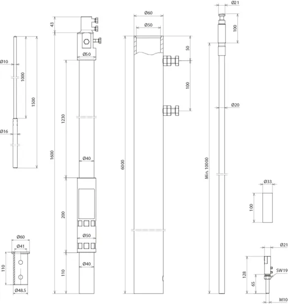 Il palo di captazione divisibile / set è composto da: – asta di captazione in Al, Ø 16/10 mm, lunghezza 1500 mm – tubo portante in PRFV/Al, Ø 40/50 mm, lunghezza 1600 mm – adattatore in Fe/tZn, Ø 40/50 mm – tubo del palo in Fe/tZn, Ø 60 mm, lunghezza 6000 mm (max lunghezza di trasporto) – Conduttura HVI light plus (preassemblata, posa all’interno del tubo)